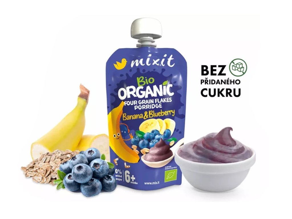 Když jde o naše malé Mixiťáky, chceme pro ně jen to nejlepší. Proto jsme do této kaše dali kromě bio banánu a bio borůvek také bio vločky z ekologického zemědělství. Pro dodání komplexních živin jsme zvolili rovnou čtyři druhy vloček – žitné, ovesné, pšeničné a ječné. A ovoce přirozeně sladké a dokonale zralé. V této kaši najdete jen ty nejlepší ingredience, žádné zbytečné přísady. Nepřidali jsme žádný cukr ani konzervanty, protože věříme, že pro děti je nejlepší to nejpřirozenější. Kapsička je znovu uzavíratelná, připravená na cesty i na doma a není potřeba ji ohřívat. Je tak ideální pro všechny malé Mixiťáky, už od ukončeného 6. měsíce.