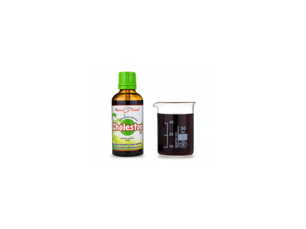 Cholestop (bylinná tinktura - bylinné kapky z řady Bylinkářovo tajemství). Přírodní bylinný celkový (komplexní) extrakt z léčivých rostlin pro normální hladinu cholesterolu v krvi (pro omezení oxidace a usazování cholesterolu, pomáhá rozpouštět usazeniny v cévách).