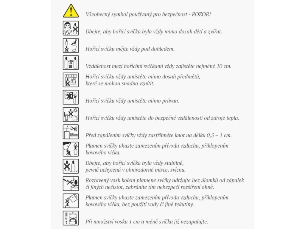 Upozornění a skladování: Umístěte mimo dosah dětí a domácích zvířat. Neumisťujte na místo s průvanem, zkrátí se tím doba hoření. Nenechávejte hořet bez dozoru. Umístěte na tepelně odolný povrch. Skladujte mimo dosah slunečních paprsků.