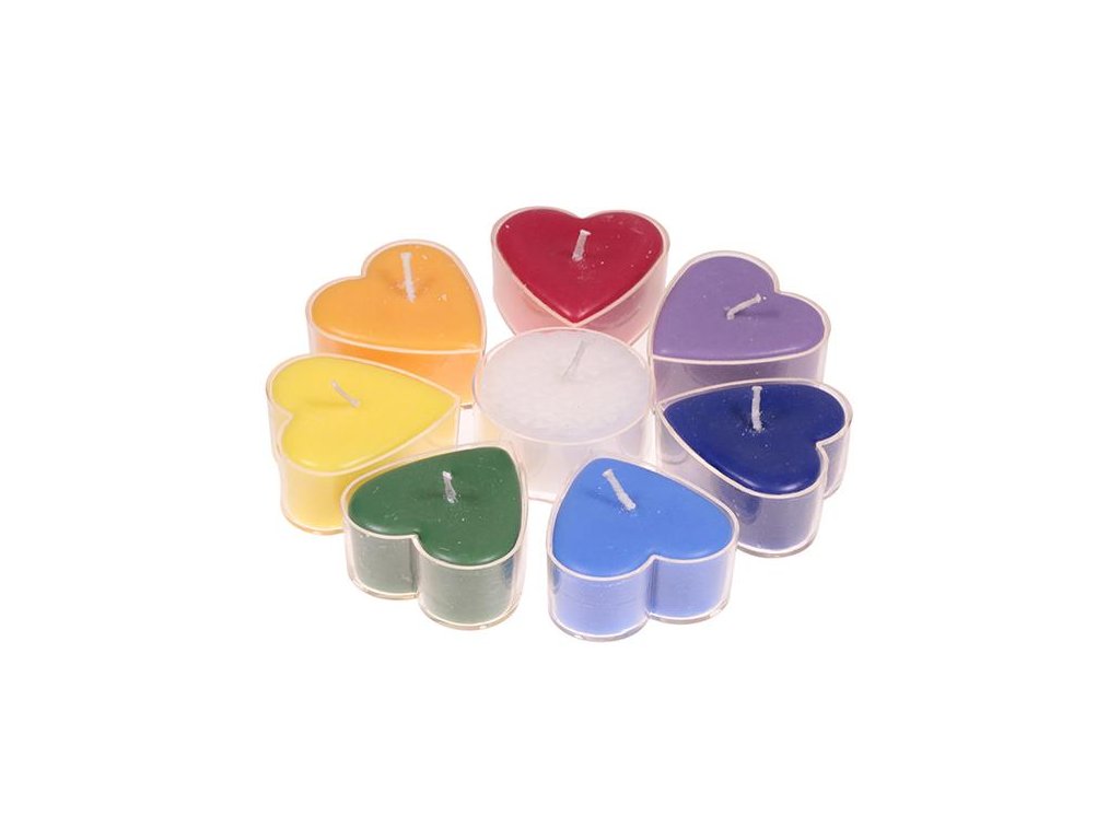 Sada sedmi svíček ve tvaru srdce + 1 bílé kulaté čajové svíčky s reliéfem květu života. Vyrobeno 80% ze stearinu (udržitelný palmový vosk) a 20% z kokosového vosku. Jsou v průhledném nehořlavém kalíšku z polykarbonátu.