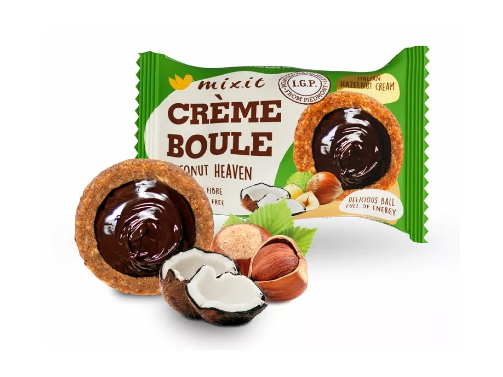 Ochutnejte Crème boule, ve francouzském překladu je to doslova krémová koule, která pod lahodnou vrstvou výběrových datlí a kokosu skrývá sametový krém z piemontských lískových oříšků. Tahle koule vám při mlsání udělá jednoduše boule až za ušima, o to se postará chuťová harmonie datlí a jemně nastrouhaného kokosu bez palmového oleje a bez zbytečných umělých přísad a chemie. Crème boule jsou dokonalým zdrojem rychlé a nebesky dobré energie, kterou můžete mít vždy po ruce.