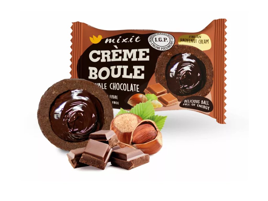Ochutnejte Crème boule, které pod lahodnou vrstvou výběrových datlí a kakaa skrývají sametový krém z piemontských lískových oříšků. Tahle koule vám při mlsání udělá jednoduše boule až za ušima, o to se postará chuťová harmonie jednotlivých pečlivě vybraných ingrediencí bez palmového oleje a bez zbytečných umělých přísad a chemie.