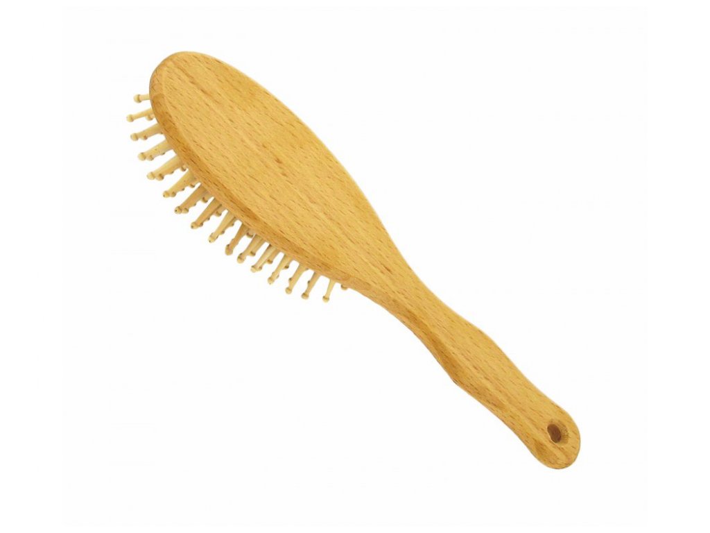 Zakulacené dřevěné ostny, díky nimž je tento vlasový kartáč: