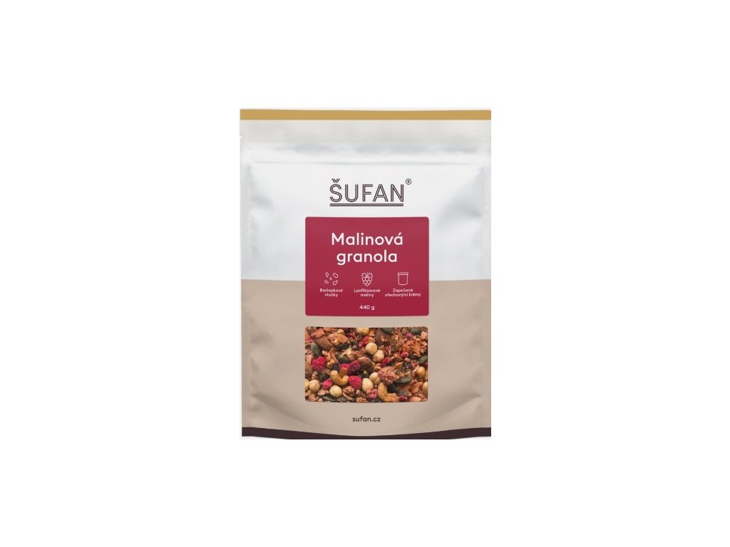 SLOŽENÍ: Bezlepkové ovesné vločky, dýňová semínka, kešu ořechy, mandle jádra, lískové ořechy, kokosová pasta, kokos chips, med, lyofilizované maliny 4,5 %, skořice, sůl.