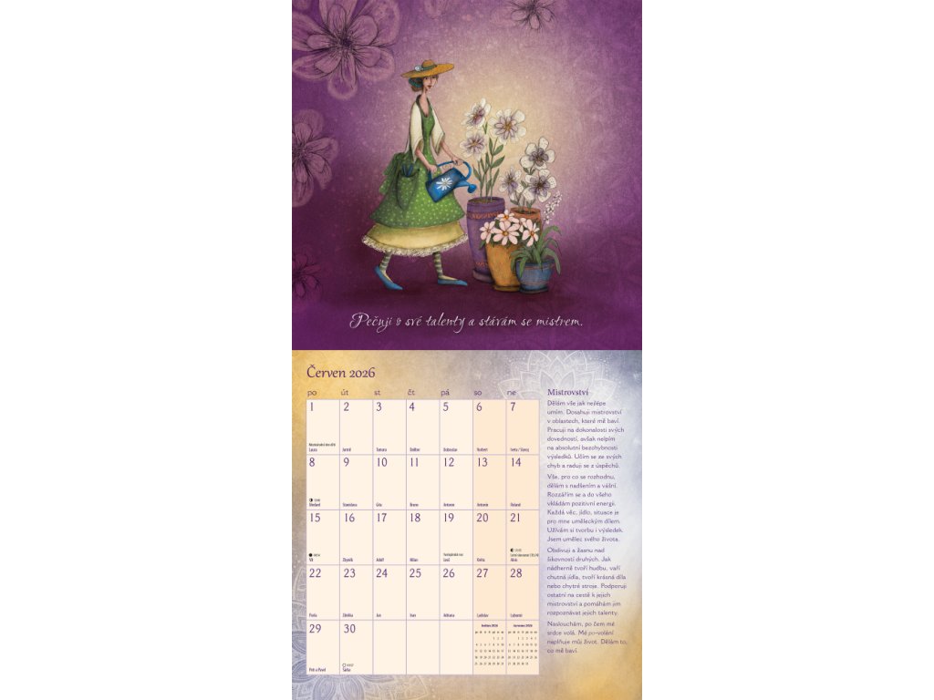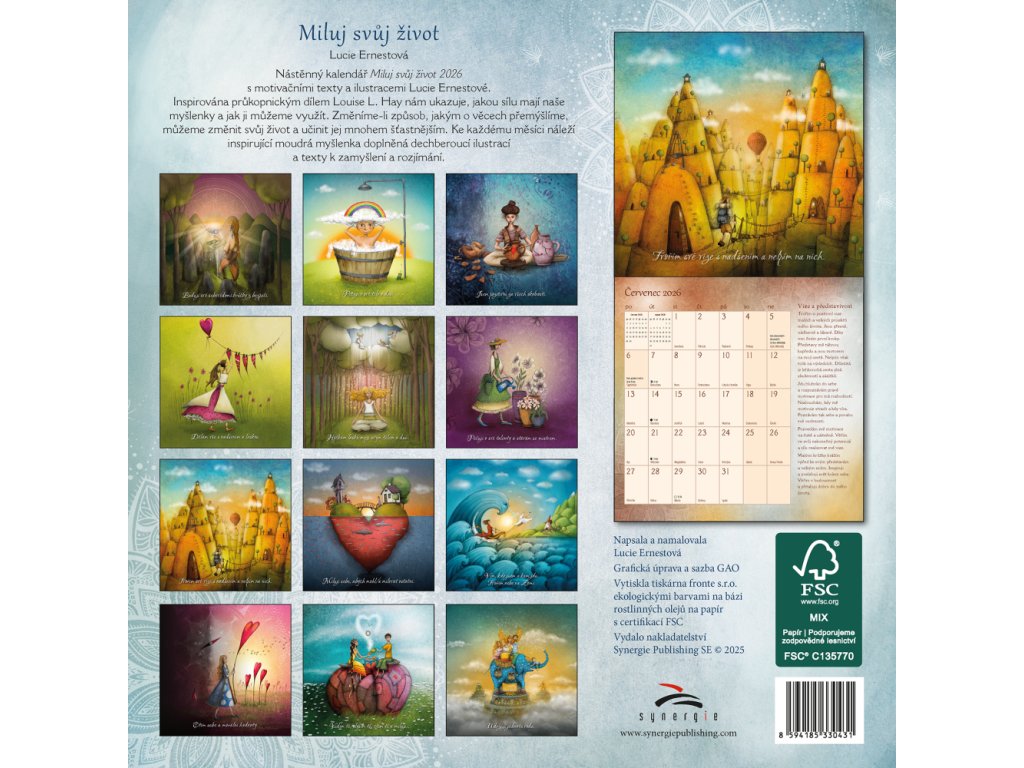 Nástěnný kalendář Miluj svůj život 2026 s motivačními texty a ilustracemi Lucie Ernestové. Inspirována průkopnickým dílem Louise L. Hay nám ukazuje, jakou sílu mají naše myšlenky a jak ji můžeme využít. Změníme-li způsob, jakým o věcech přemýšlíme, můžeme změnit svůj život a učinit jej mnohem šťastnějším. Ke každému měsíci náleží inspirující moudrá myšlenka doplněná dechberoucí ilustrací a texty k zamyšlení a rozjímání.