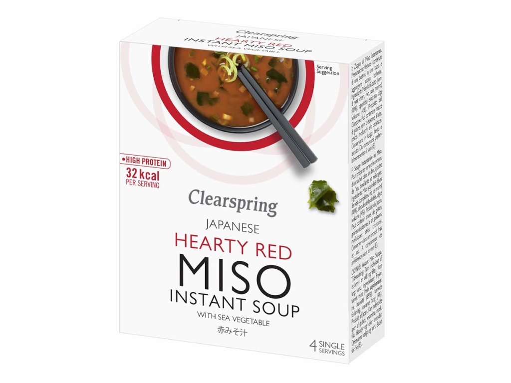 Složení: Lyofilizované miso* (73 %) (miso z hnědé rýže* [celé SÓJOVÉ BOBY*, hnědá rýže*, mořská sůl], JEČNÉ miso* [celé SÓJOVÉ BOBY*, JEČMEN*, mořská sůl]), lyofilizované SÓJOVÉ miso* (20 %) (celé SÓJOVÉ BOBY*, mořská sůl, JEČNÁ mouka*), sušené wakame (4 %), sušená zelená cibulka* *produkt ekologického zemědělství
