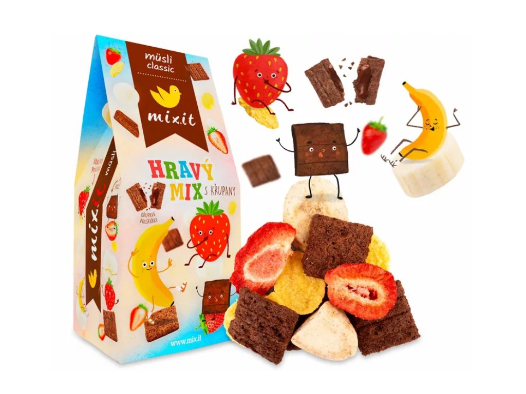 Snídaně bude odteď zábavou i pro ty nejmenší Mixiťáky! Na hrstech cornflaků dovádí veselí Křupani - Jahůdka Pohůdka, Pan Banán a kakaový Pan Polštářek. Tahle parta spolehlivě dodá našim broučkům potřebné vitamíny a snídani ten správný šmrnc, který navodí bezstarostnou náladu i dospělákům. :)