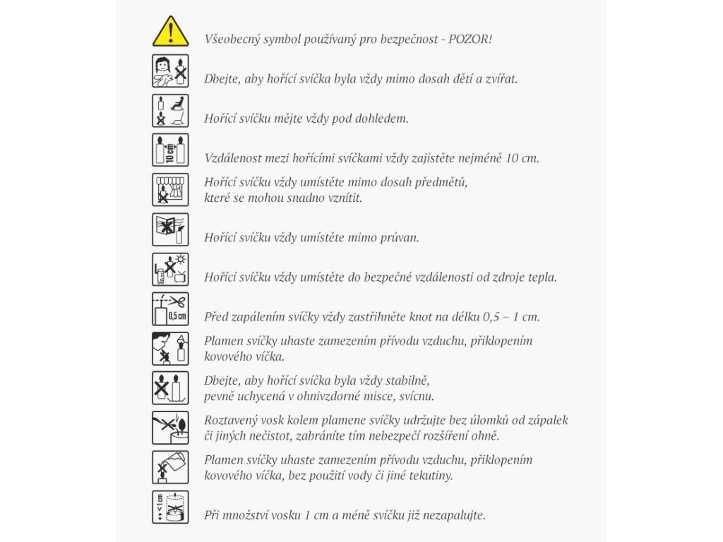 Upozornění: Umístěte mimo dosah dětí a domácích zvířat. Neumisťujte na prašné místo, zkrátí se doba hoření. Hořící svíčku nenechávejte bez dozoru. Umístěte na tepelně odolný povrch.