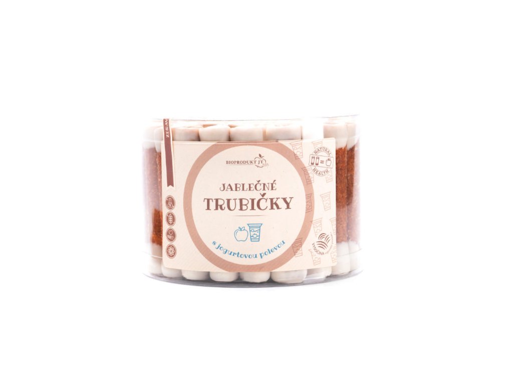 Složení: Jablečná dřeň 79 %, JOGURTOVÁ poleva 20 % (cukr, plně ztužený rostlinný certifikovaný tuk z trvale udržitelných zdrojů: palmojádrový, palmový a shea), sušené MLÉKO odstředěné, sušená SYROVÁTKA, sušený JOGURT 1,6 %, emulgátor: SÓJOVÝ lecitin, regulátor chuti: kyselina citronová, aroma, sůl, kokos 1 %.