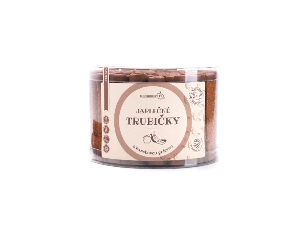 Složení: Jablečná dřeň 79 %, karobová poleva 20 % (cukr, plně ztužený certifikovaný rostlinný tuk z trvale udržitelných zdrojů: palmový a bambucký), sušená SYROVÁTKA, karobový prášek, emulgátor SÓJOVÝ lecitin, kokos 1 %.