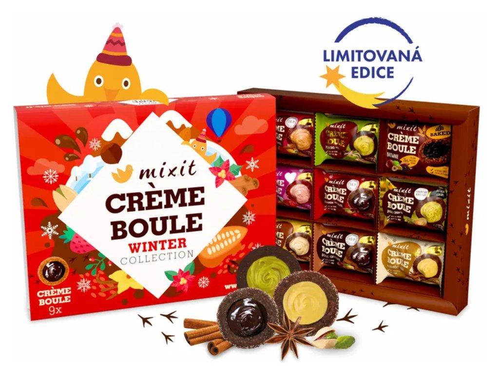 Bouleniéra je splněným snem všech fanoušků Crème boulí – v designovém balení na vás čeká devět různých druhů těchto lahodných datlových koláčků. Těšit se můžete na průřez naší nabídkou – od čokoládové klasiky přes bestsellery s lyo ovocem až po exkluzivní novinku à la vaječný likér.