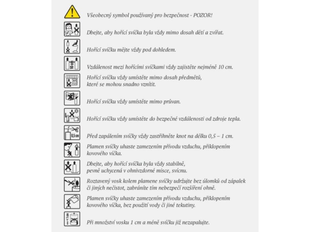 Bezpečnostní použití: Svíčku pokládejte na dostatečně tepelně odolný povrch. Nenechávejte hořet déle než 4 hodiny. Nikdy nedovolte, aby svíčka dohořela až do úplného konce. Hořící svíčku nenechávejte nikdy bez dozoru a v blízkosti lehko vznětlivých předmětů.